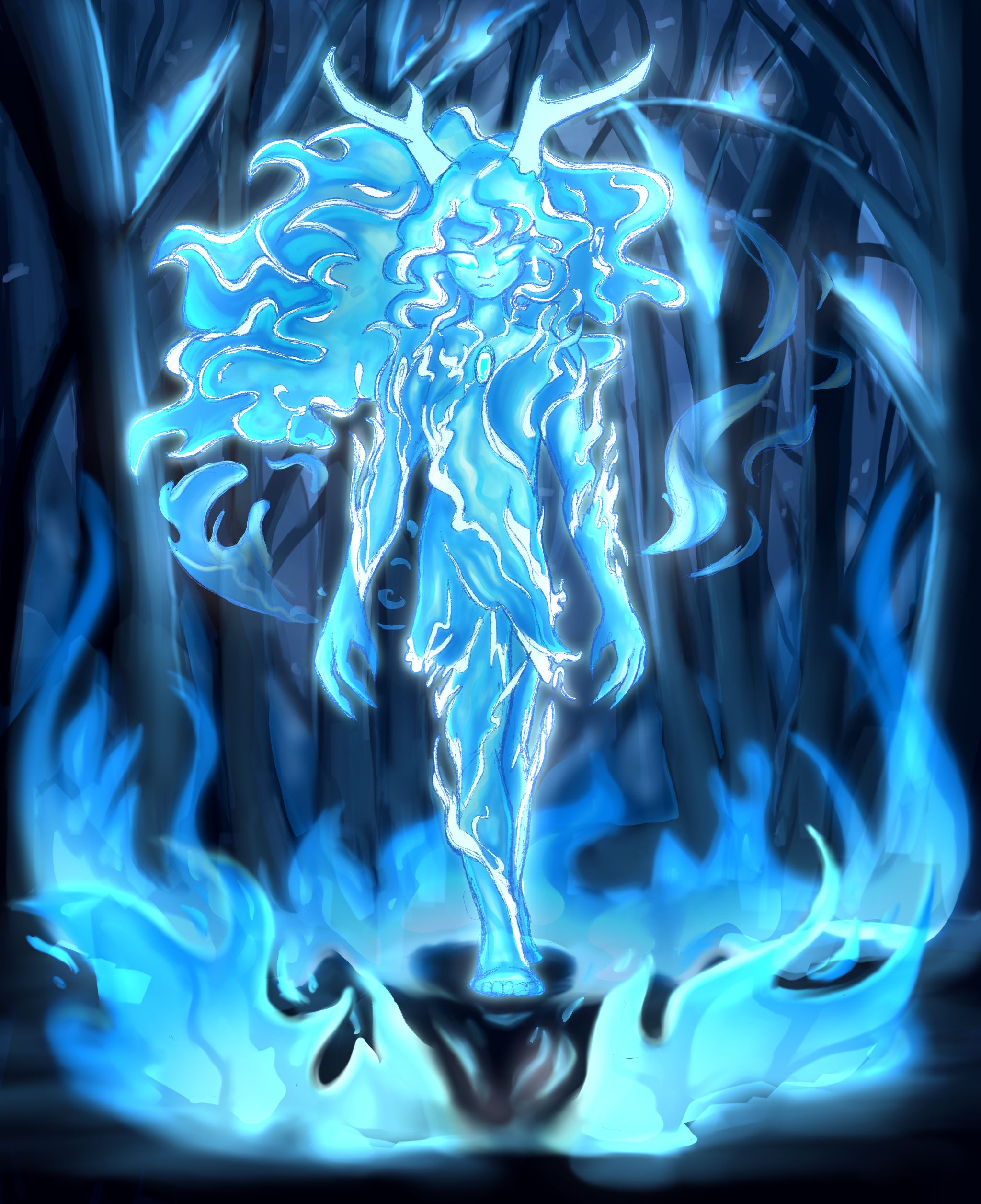 A stylised, cartoon-inspired artwork of a fire-shaped woman, created as a study in a restricted blue color palette. The piece focuses on color harmony, simplified shapes, and expressive form to convey personality and movement within a constrained tonal range.