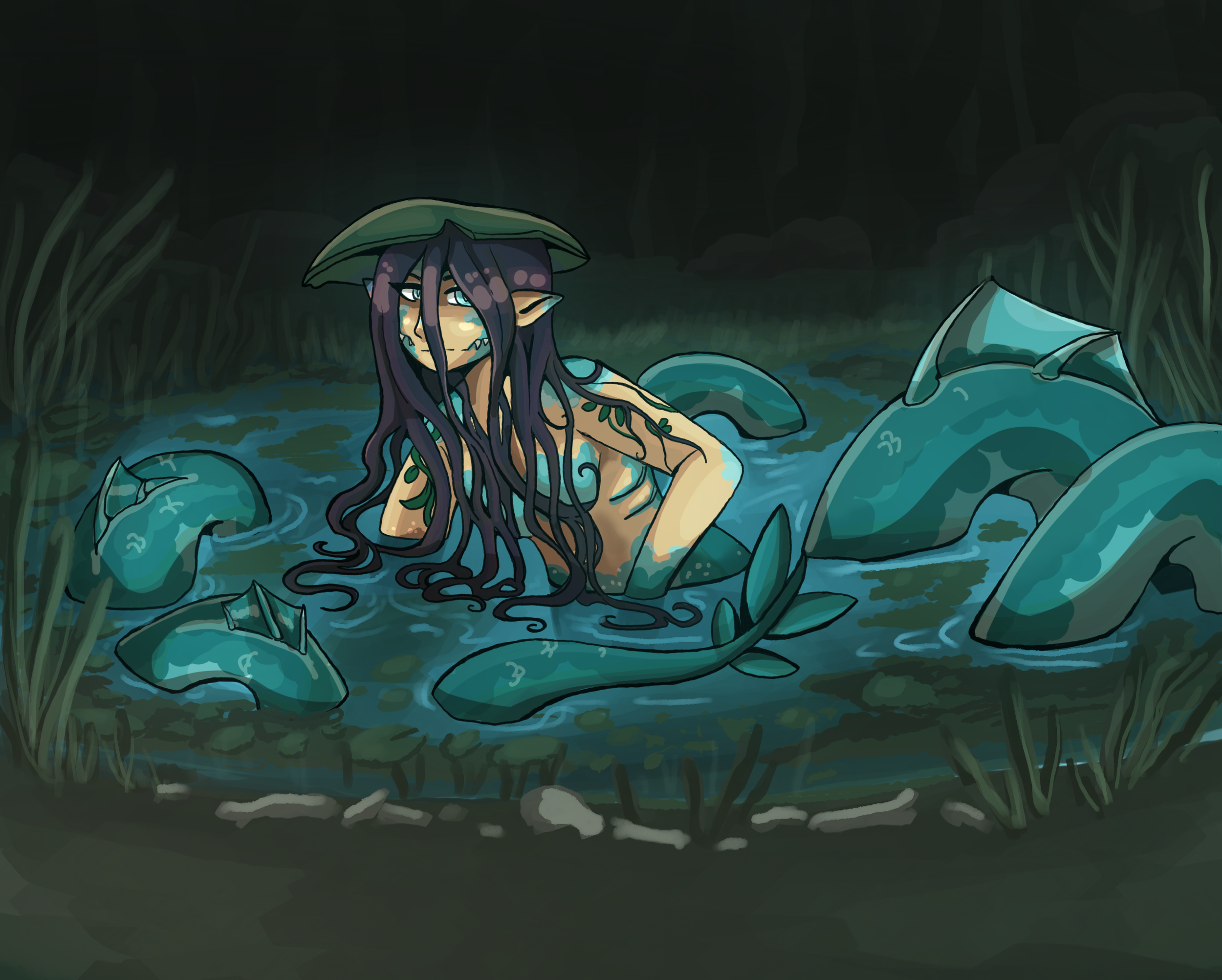 This piece has a stylised 2D fantasy look, combining graphic hand-drawn linework, simplified character shapes and painterly digital shading with a dark, atmospheric swamp palette. It is a character-focused visual story look for an indie animated series, with expressive creature design, moody lighting and strong environmental storytelling.