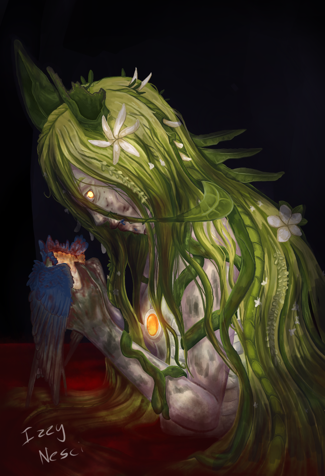 A semi-realistic study of a human-like monster consuming a bird, surrounded by blood. The artwork focuses on creating an ominous atmosphere through composition, lighting, and texture, capturing tension and visceral emotion in a dark, unsettling scene.