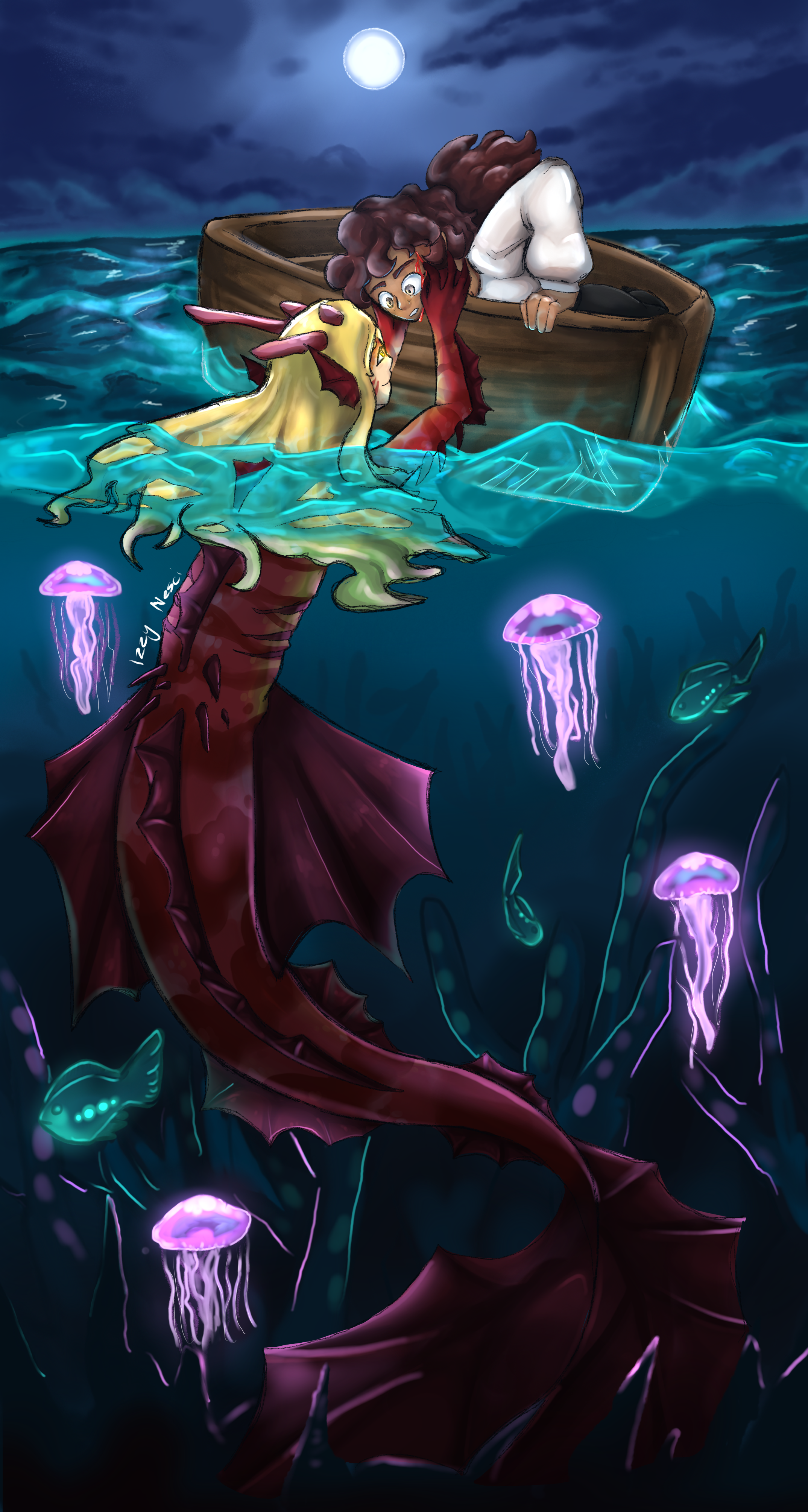 A mini scene depicting a siren entrancing a woman on a small boat, capturing the eerie beauty of a predatory lure at sea. The illustration explores atmospheric storytelling, subtle lighting, and composition to balance allure with tension in a compact, narrative-driven scene.