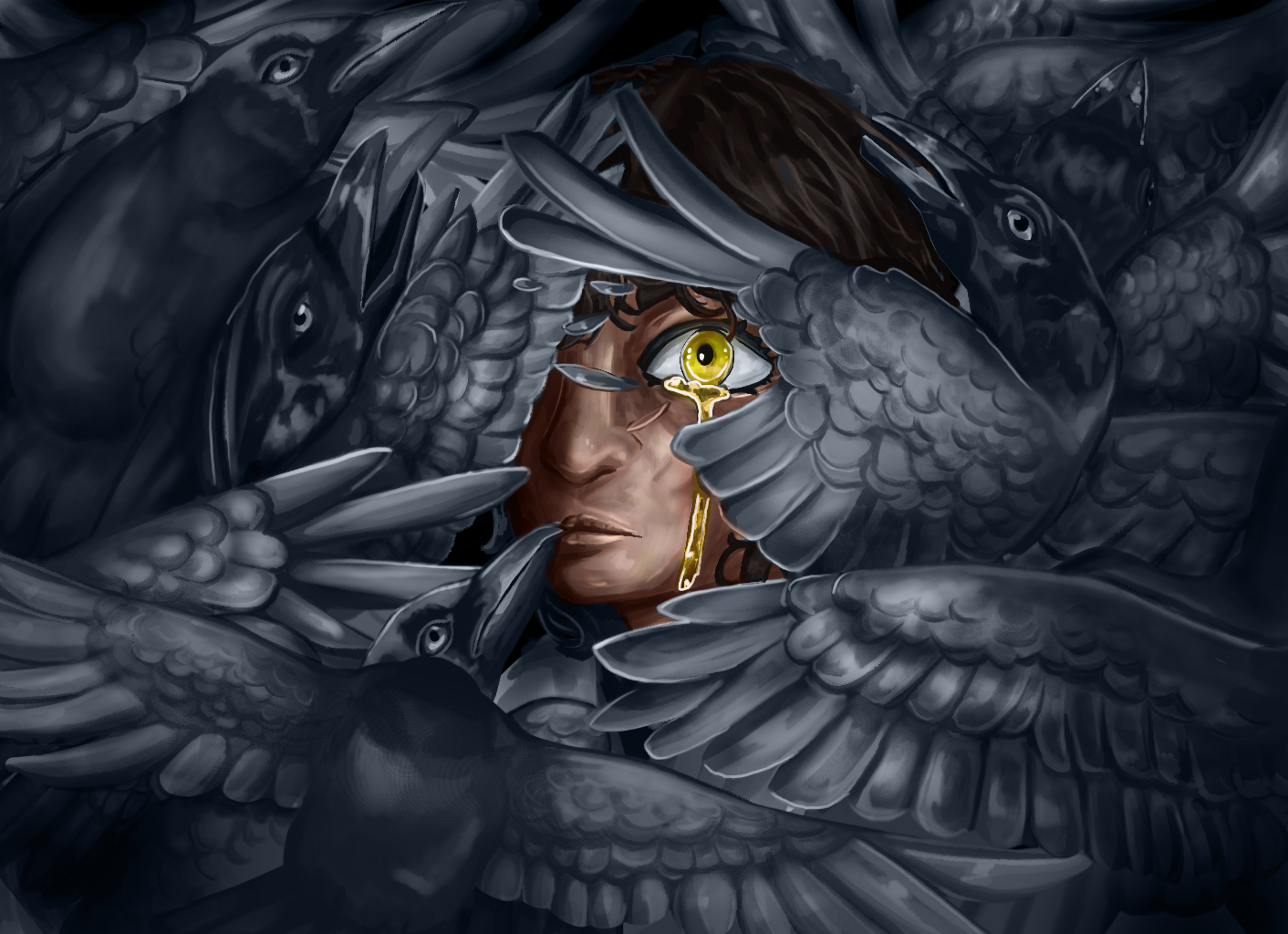A mostly grey scale illustration of a girl surrounded by corvids, with selective color highlights as focal points. This piece emphasizes tonal contrast, subtle color accentuation, and visual rhythm, exploring mood and emphasis through minimal yet impactful color usage.