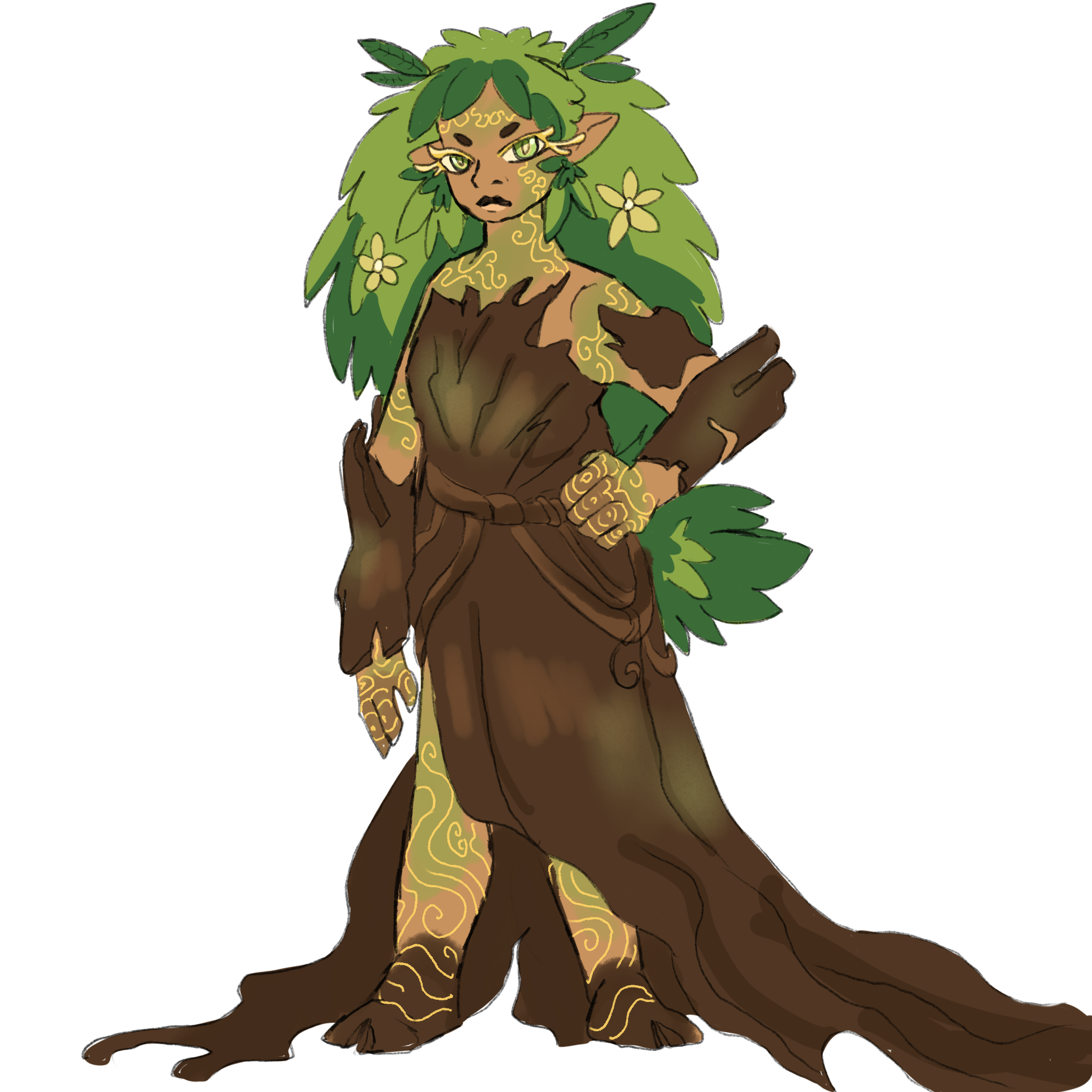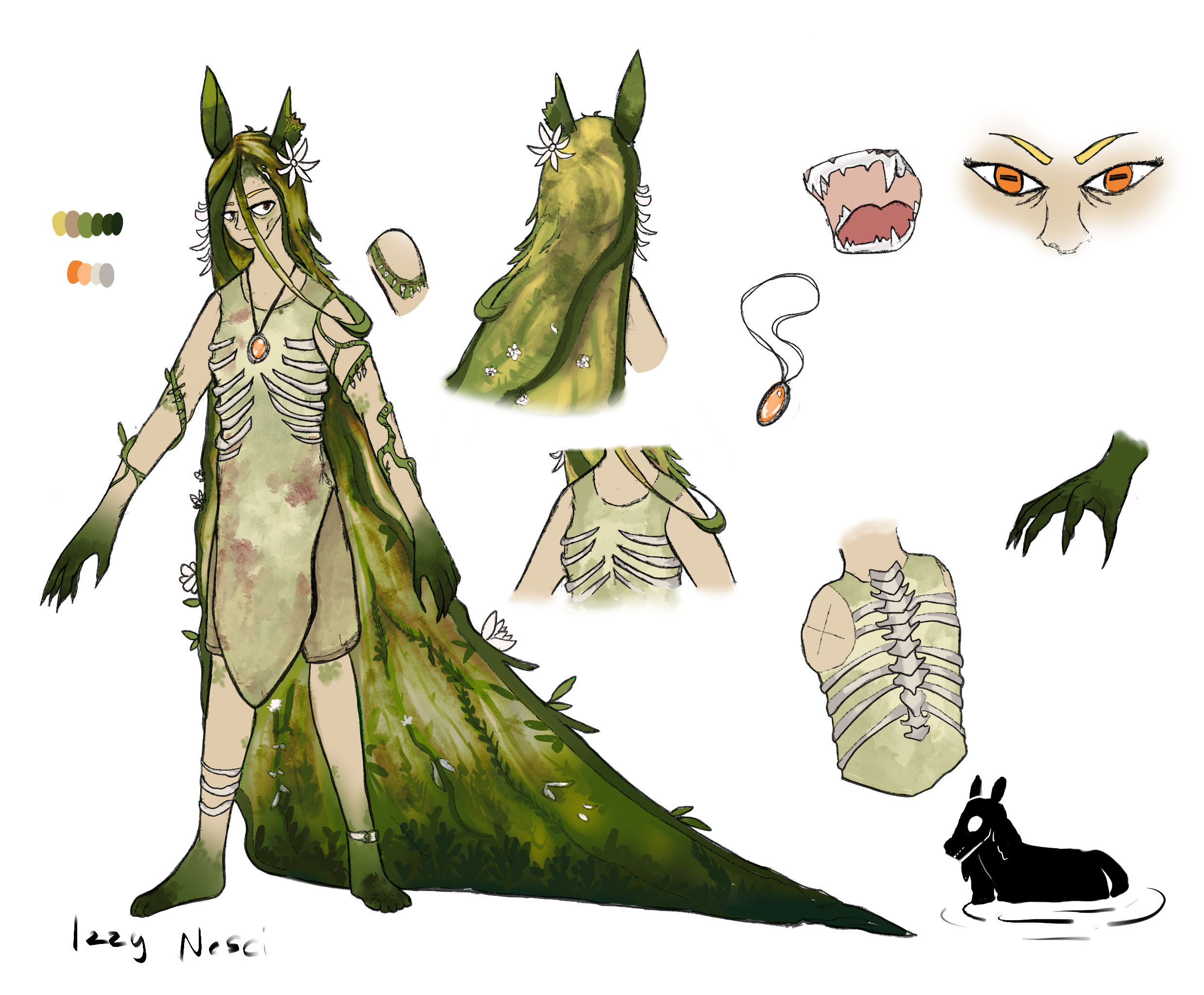 This artwork is a contemporary 2D fantasy animation character concept, blending hand-drawn and indie vis-dev influences with touches inspired by Greek mythology. Its bold silhouette, organic motifs, gives it the feel of stylised character-sheet or an animation pre-production design.