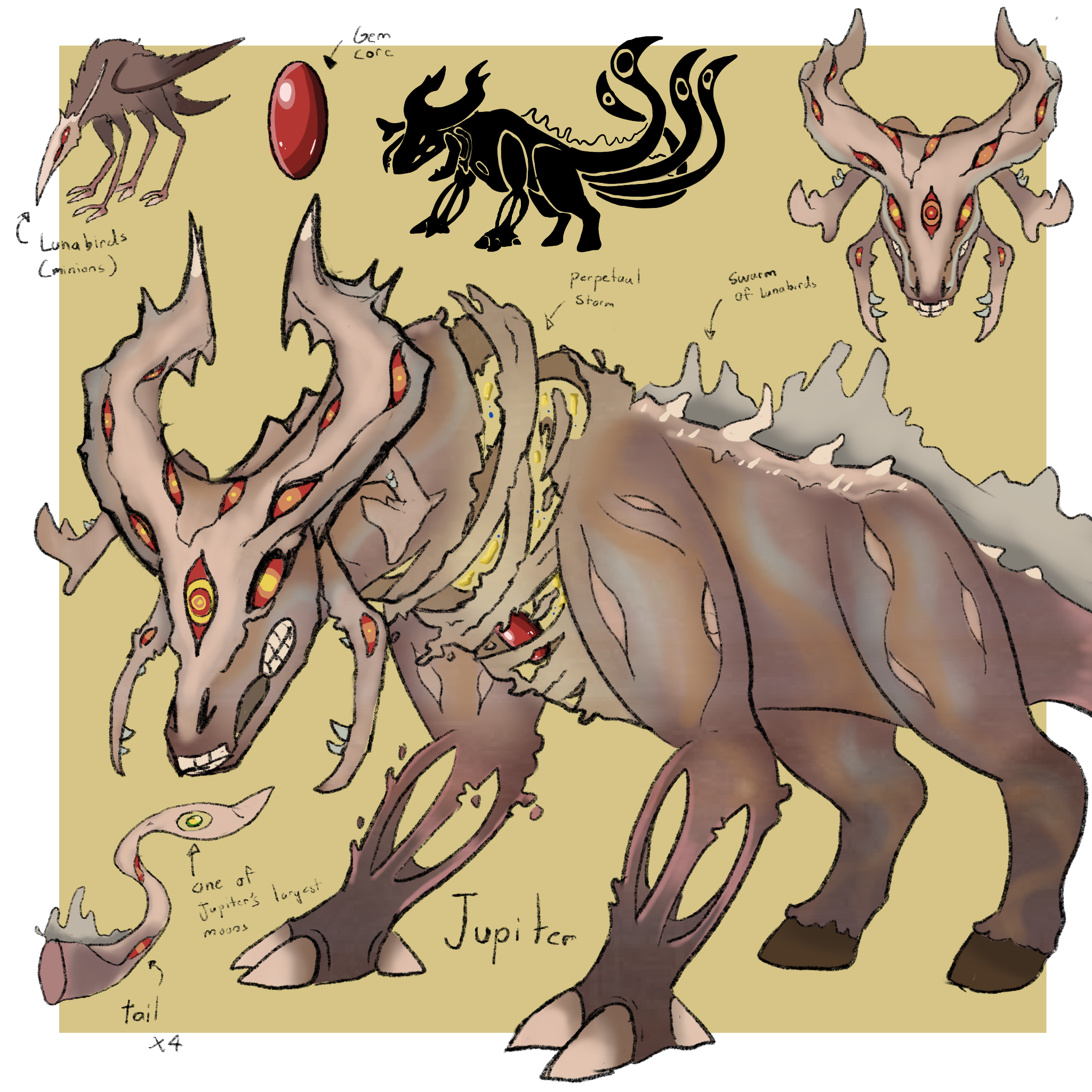 An anthropomorphic bull-like monster inspired by the planet Jupiter. Composed of countless tiny insect-like creatures, with a chest feature resembling a storm, the design merges planetary mythology with imaginative creature construction, emphasising scale, texture, and dynamic storytelling.